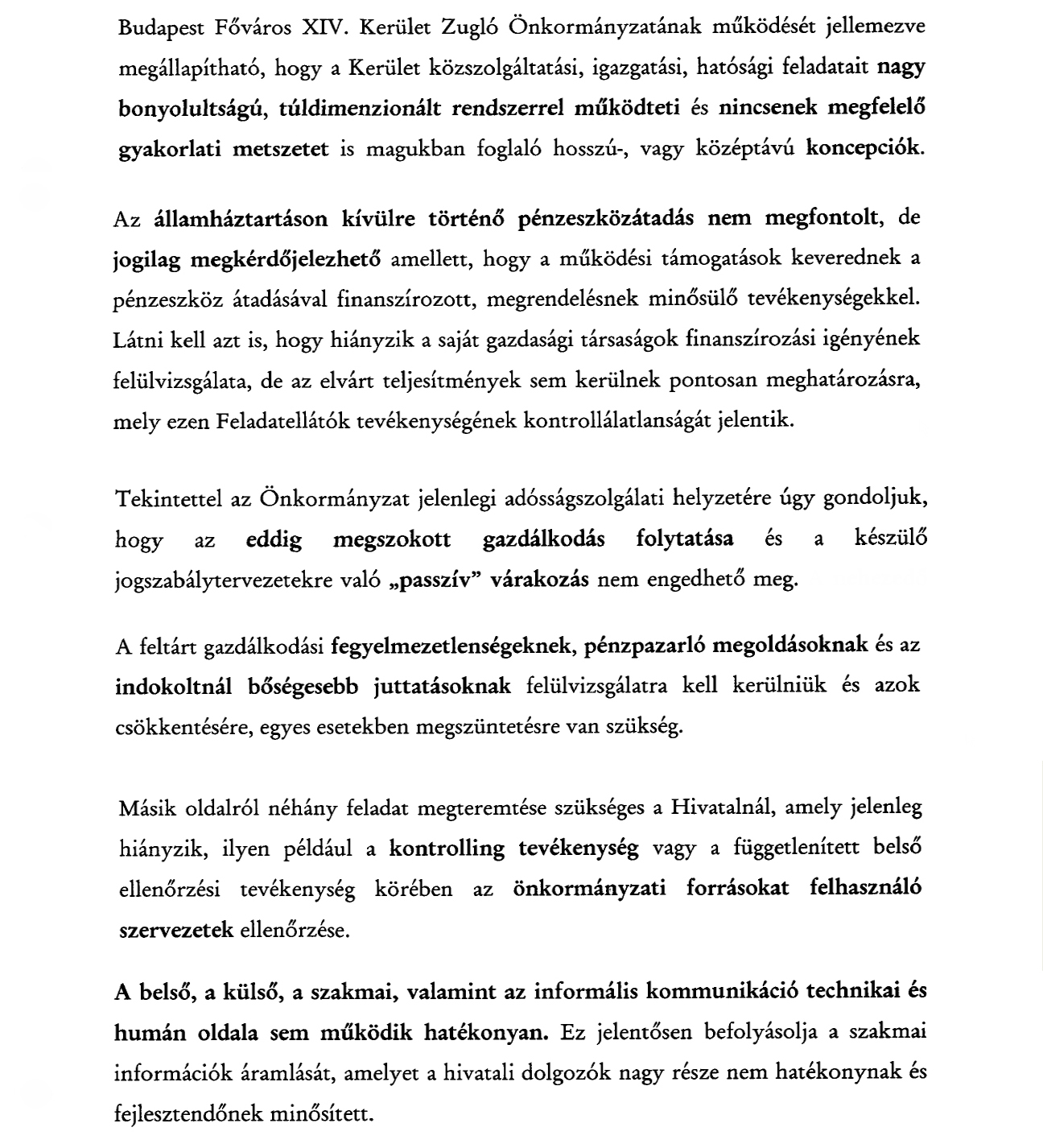 Papcsák működésével és a kerület vagyonának kezelésével nem újkeletűek a problémák. De az eseményeket követőknek is felér egy mellberúgással soktíz oldalon olvasni, mi minden nincs rendeben az önkormányzatnál. Az elemzés teljesen korrekt, felsorolja és figyelembe veszi az elmúlt ciklusból örökölt hiányosságokat, a szomorú az, hogy a megállapításait ezekkel együtt teszi. Azokból meg kiderül, hogy az elszámoltatás volt nincs, és a helyzet nem jobb, hanem sokkal rosszabb lett. Összeollóztam nektek az általam fontosnak vélt megállapításokat, itt van mindjárt a hivatal működésére vonatkozó rész: ( olvasható méretért katt a képre)
