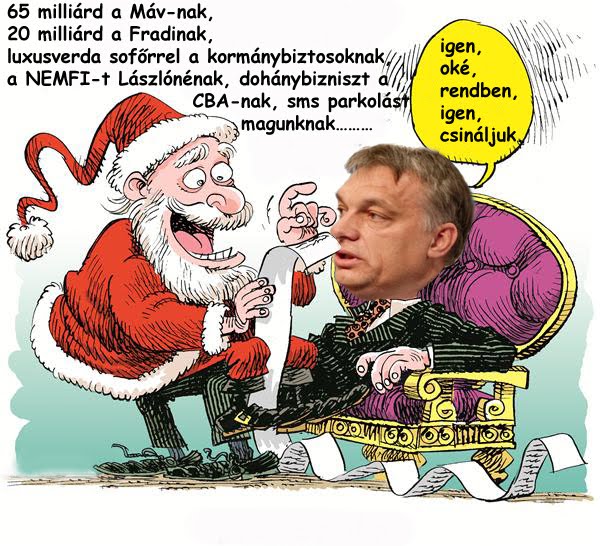 Na, mit hozott Orbán Jézuska kedves magyar választópolgár? Kordont egész Ifa platónyit, zsuppkocsiba gyűrt ellenzéki képviselőket, elvezetett Gyurcsány Ferencet, brahiból Police Tours társasutazásra benevező MSZP-s képviselőket, utcabált ahol együtt lépett fel a Bóvli, a Hazaárulók, az Elkúrtátok és az Orbán Takarodj zenekar, akik kórusművekkel szórakoztatták a Kedves Vezető odabent szorgalmasan körmölő sztahanovbotjait. Remélem örülsz, hisz nagylelkű ajándék ez neked, kedves választópolgár.