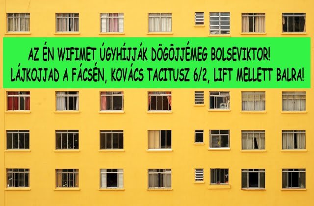 Azért csak más lenne, ha ezt látná a troli ablakból is az utazóközönség, és szerintem az autósok, járókelők között is népszerű lenne. De megtehetem, hogy a céges wifit is átnevezem valamire, és nyilvánvalóvá teszem az ügyfélkörnek, hogy nem tetszik a rendszer. Igaz, politikának az üzletben nincs helye, de majd mostantól legalább tudják hová jönnek. Esetleg a teljes hatás kedvéért a wifim elnevezése láttán visszafordulókat még le is orbánbérenc-rendszerjanicsározom, hogy teljes legyen a fíling.