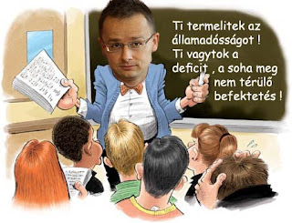 Biztos célszerű szembesíteni a jövő nemzedékeként emlegetett diáksereget még az évnyitó előtt, hogy az eddigi dogmákkal ellentétben ők nem a jövő zálogai. Orbán Viktor numero uno szinkrontolmácsa szerint legújabban ők váltották fel gyurcsányahibást, ők termelik az államadósságot, ők a deficit a Nemzeti Együtthülyülés Rendszerében. De megszorítás az nem lesz, ( videó 1:45-től) legfeljebb sarkalatos törvényekkel helyretesznek pár olyan szirszart, mint az éhkoppon lévő oktatás, ami csak öli a pénzt, mint Orbán beszéd az agysejteket.