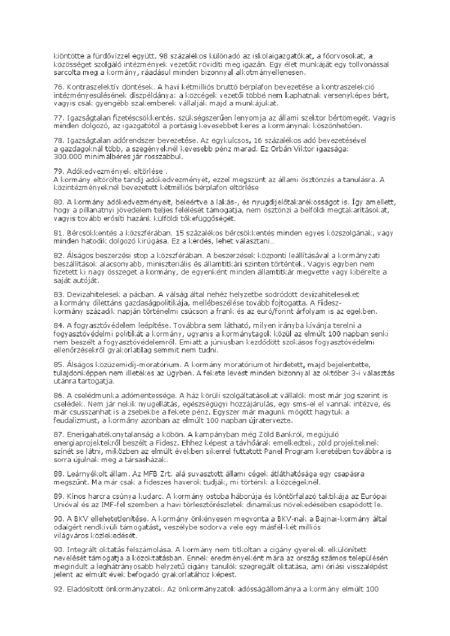 A következő pont viszont felesleges Viktorkám! A kormány legfontosabb teendője az ország jelenlegi helyzetében a tizenharmadik havi nyugdíj visszaállítása, és 2011 január elsejétől a 14. havi bevezetése. Ettől fontosabb pillanatnyilag nincs, és a jövőben sem lesz! De nehogy azt hidd, ez a mi érdekünk. Dehogy. Ez a ti érdeketek, hacsak nem akarjátok, hogy azok a mocskos komancsok rátok süssék a hazugság bélyegét! Én ott tapsoltam neked Egerben az első sorban szokás szerint, mikor bejelentetted: "Az új munkahelyek létrehozása és az aktív keresők számának növekedése nyomán 2006 és 2010 között a 14. havi nyugdíjat is be lehet vezetni "