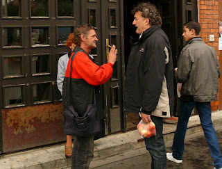 Azt is leveszi, hogy itten' éppen kampányfilm forog, hisz a stáb kamerástól beveszi magát a csarnokba emberi oldalt mutatni a választók felé. Nyilván nem rondítunk bele a felvétel nagyszerűségébe, hanem kivárjuk amíg a jelölt odabent végez, és a vágóképek elkészülnek. Kint a csarnok előtt még elkapja egy kéretlen beszélgető, amit szintén dokumentálnak. Itt láttam elérkezettnek a pillanatot, hogy lőjek pár képet én is, ahogy tettem ezt a többi jelöltről is a mellékeltek szerint.