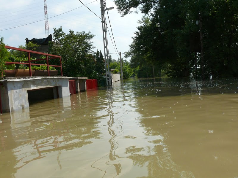 Segítek, ez az idei dunai áradás. Az meg ott bent a víz közepén én vagyok az úton állva, és ennyi látszik ki a 190 centimből. Ez az utcasarok, -a hazajutás útja- ahol a jövendő boldog tulajdonos majd gatyára vetkőzik árvíz idején, és hazaúszik vacsorázni egy nehéz nap után. Egészen közelről szemlélheti az elvehetetlen dunai luxuspanorámát.